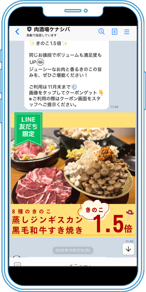 肉酒場ケナシバのLINE運用で特徴的なのは、再来店導線を整理する施策としての効果だけでなく、店舗運営の負担を減らす視点も同時に持っていた点です。