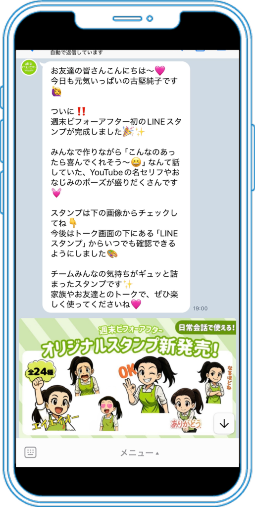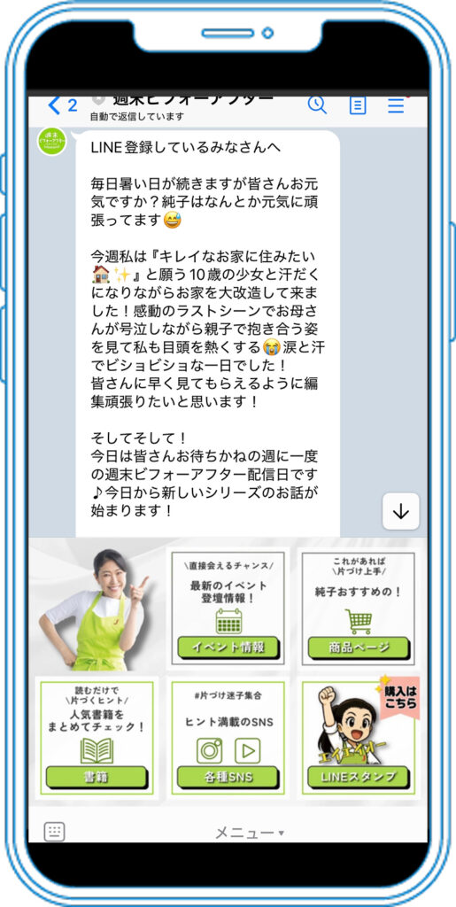 また、ファンに向けた一言メッセージや日常で役立つ片づけ情報を定期的に配信することで、LINEを「必要な情報が届く場所」として定着させていきました。