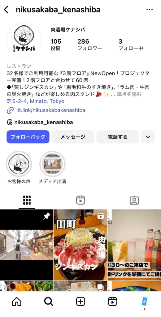基本情報をプロフィールに書く、位置情報を設定するなど、細かい設定も必要です。SNSを通して食べログや店舗情報に行き着く人も多いため、潜在層の顧客の第一印象となる場所、と考えて設定、投稿をしてみましょう。