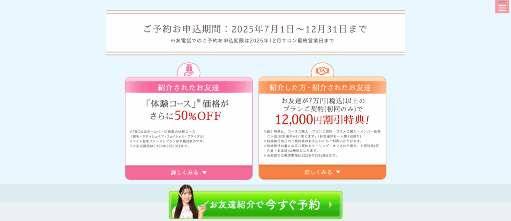 エステティックTBCでは、会員からの紹介で初めて来店する方に、体験コースを通常価格の半額で提供しています。