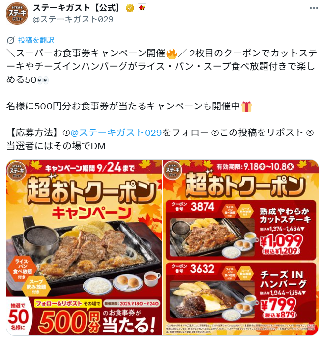 また、下記のように『この投稿をリツイート&フォローで、店頭で使える500円割引クーポンを全員にプレゼント!』といったキャンペーンをSNSで紹介する施策も、アパレル店や小売店への来店を促進できる有効な方法です。
