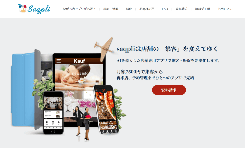 Saqpliは月額7,500円から利用できる店舗向け集客アプリで、サロンや飲食店など幅広い業種の予約管理に対応しています。