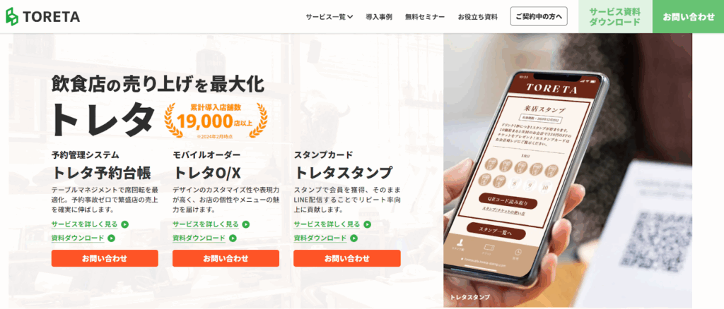 トレタは、飲食店の予約管理に特化したiPad専用アプリで、累計19,000店以上の導入実績を誇ります。