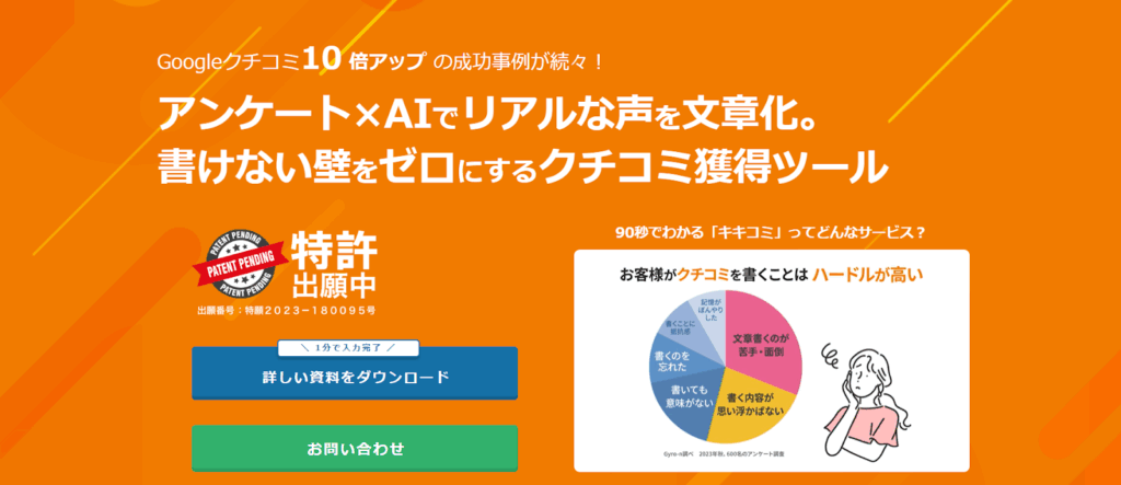 キキコミは、アンケート形式で集めたお客様の回答をもとに、AIが自然な口コミ文章を自動生成してくれるツールです。