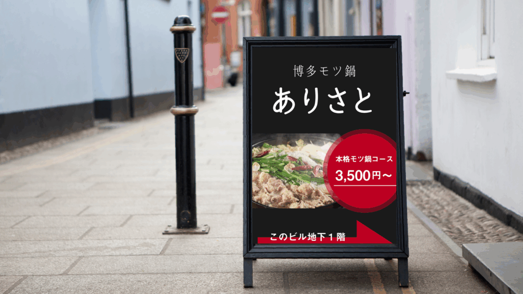 看板は、通行人の目を引くデザインを盛り込み、適切な場所に設置することで、通行人の認知度を向上させつつ店舗への誘導を行うこともできます。