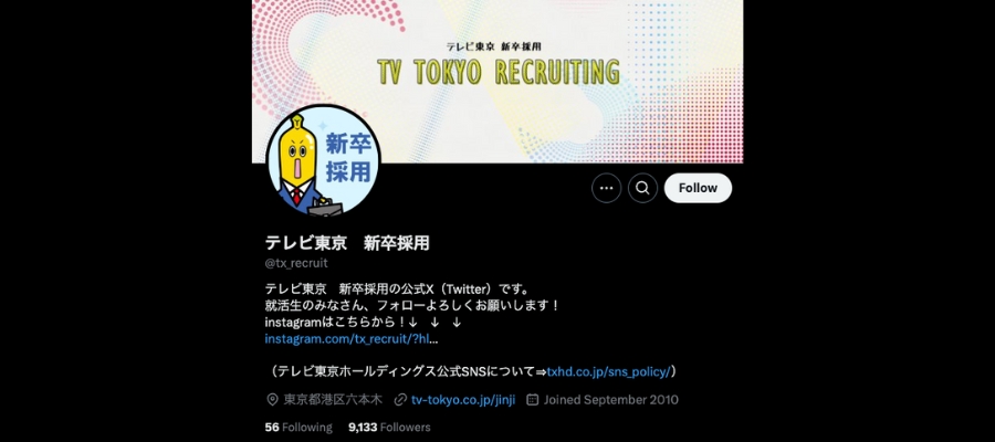 ユニークな投稿で企業文化をアピール。社員の仕事風景やテレビ局ならではの舞台裏を紹介し、求職者に「楽しそう」と思わせる工夫をしています。