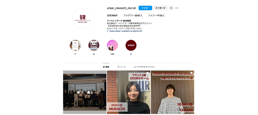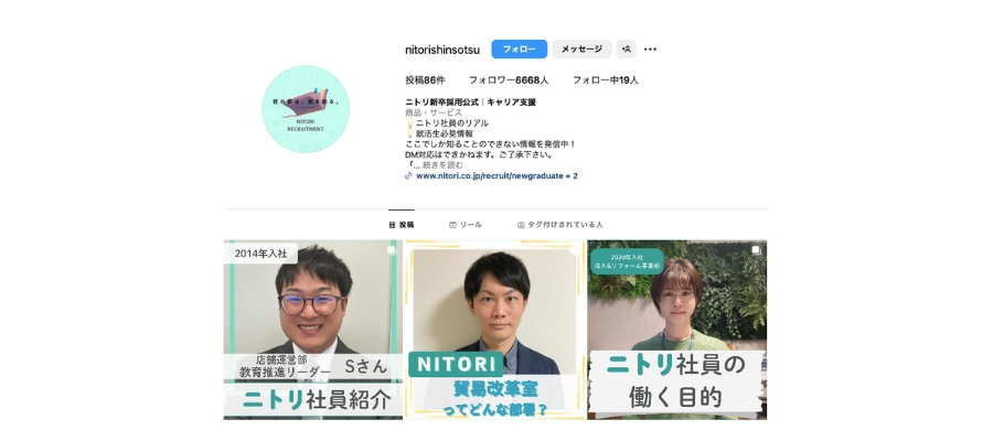 商品開発ストーリーや社員インタビューを中心に、企業理念や働く魅力を発信。親しみやすい投稿で多くの求職者にブランドの魅力を伝えています。