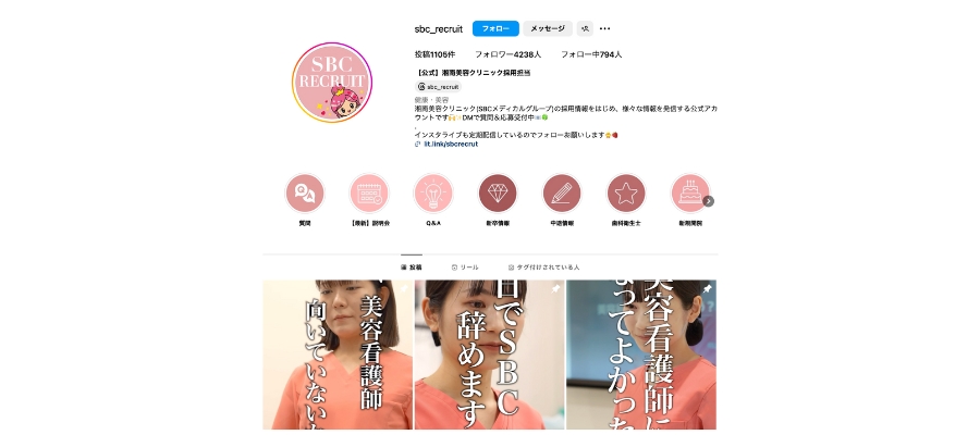 ストーリーやショート動画を使い求職者からの疑問や不安に積極的に回答しています。これにより、求職者とのコミュニケーションを強化し、美容業界に興味を持つフォロワーを獲得しており、効果的な採用活動に繋がっています。