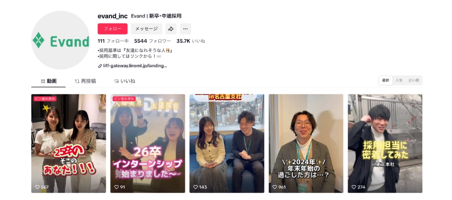 仕事の様子や社員の日常を切り取ったカジュアルな動画を投稿。職場の「楽しい一面」を強調し、若い世代の応募意欲を高めています。