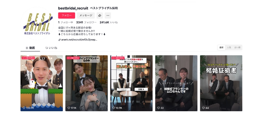 TikTokを通じて、結婚式場で働くスタッフの一日や職場の雰囲気を伝えることで、ブライダル業界の魅力やリアルな日常を発信し、求職者が働くイメージを持ちやすいコンテンツを展開しています。
