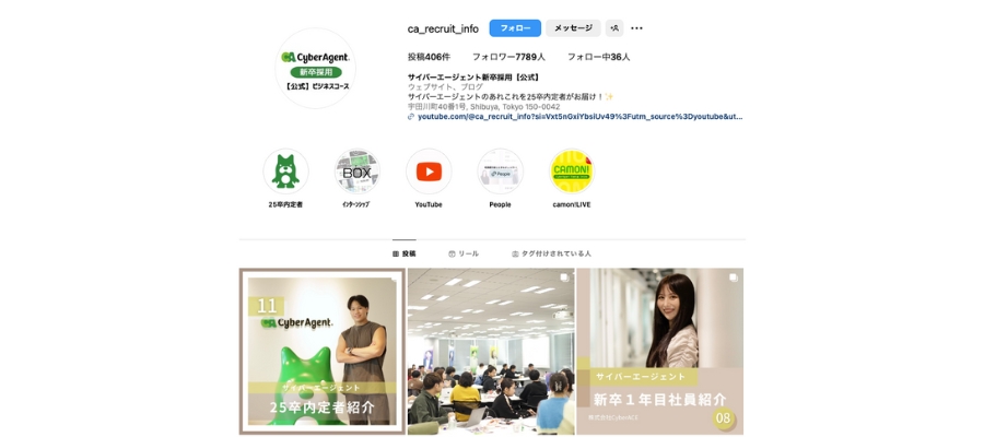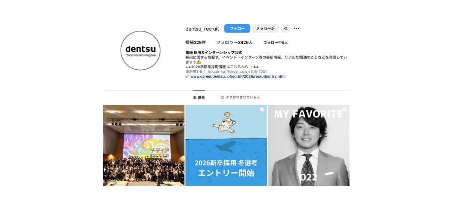 若手社員の活躍やチャレンジ精神を強調した投稿が特徴。社員のリアルな声やプロジェクトの裏側を通じて、クリエイティブな職場の魅力を訴求しています。